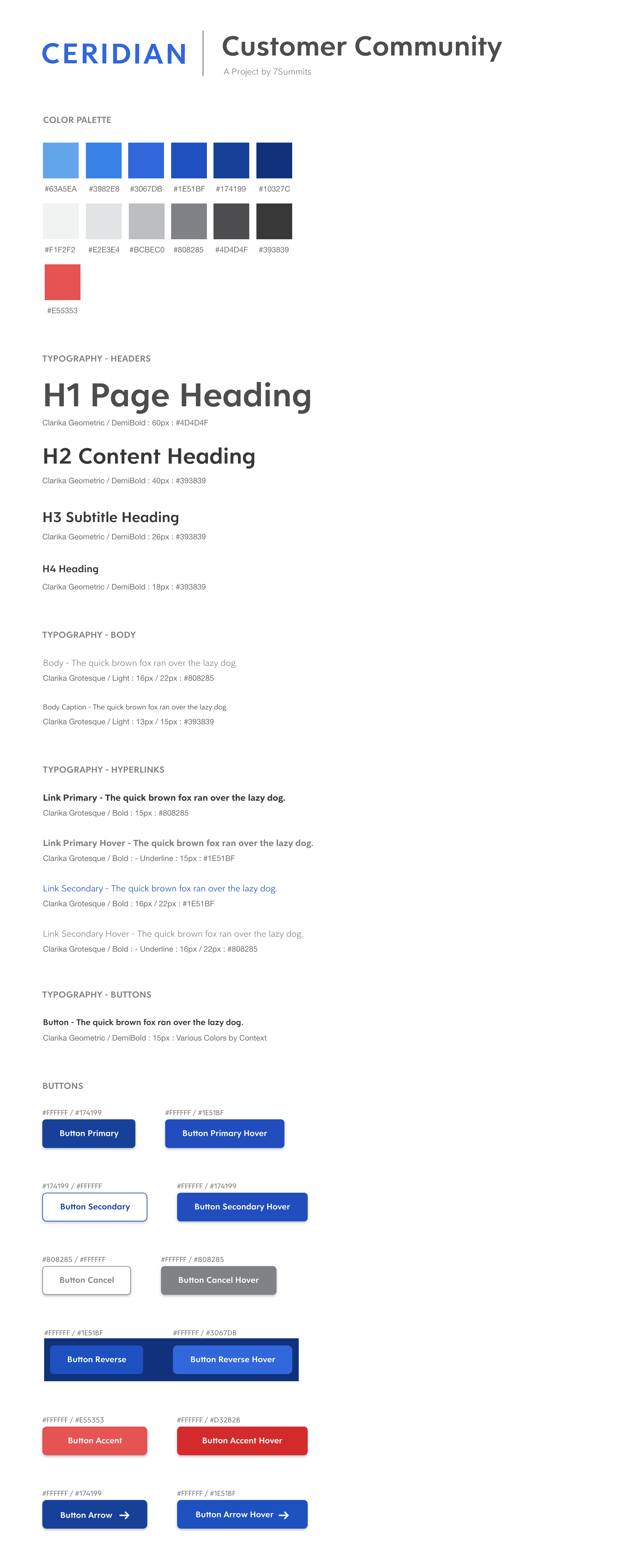 The existing Ceridian brand was simple, friendly, and helpful with a calm color palette. The new Salesforce Community needed to reflect that, so a consistent style guide was created for the build.